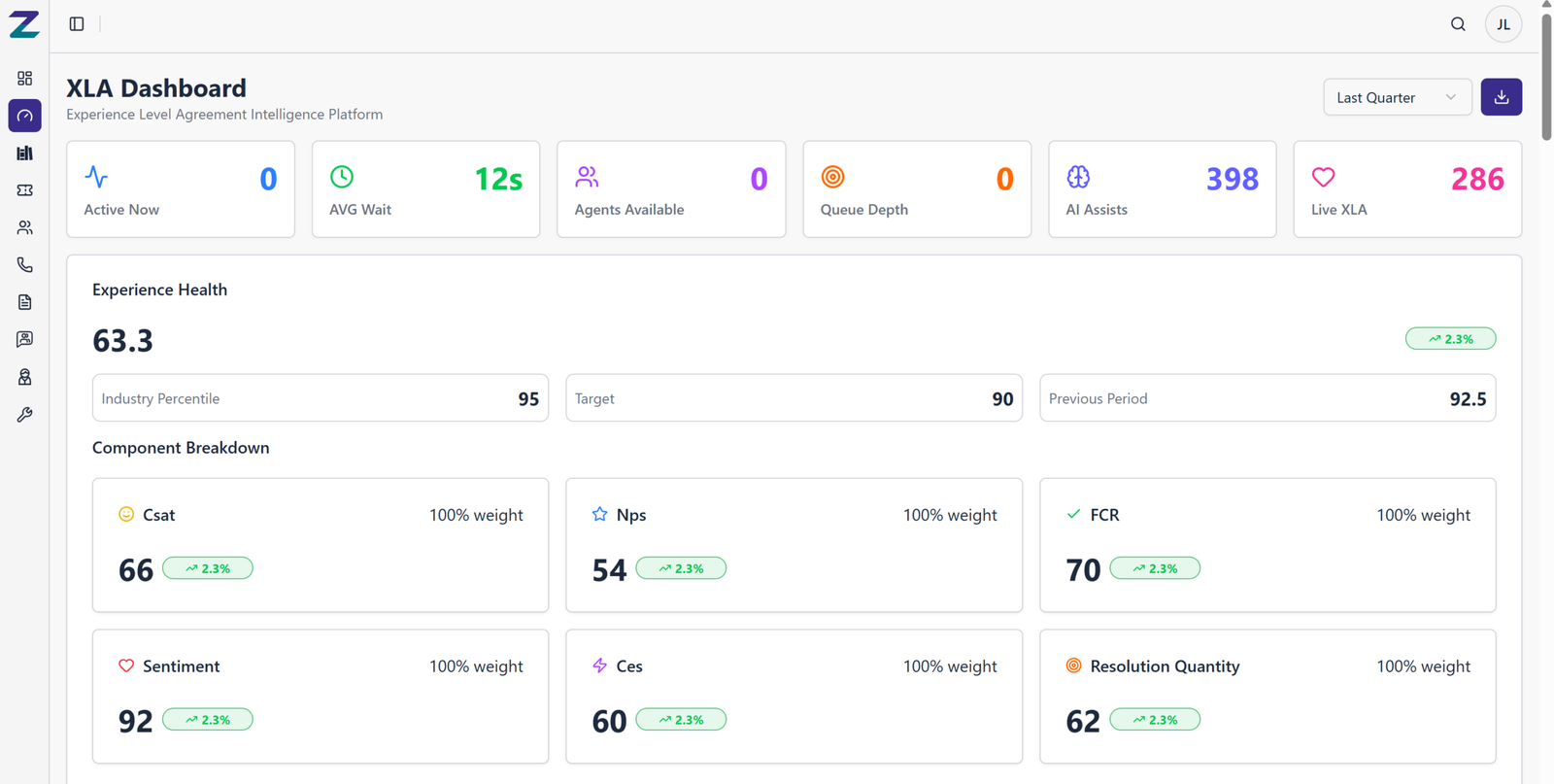 SLAs tell you the machine is running. XLAs tell you if your customers are happy. Zentara's composite XLA score fuses quality, sentiment, compliance, churn risk, and agent wellness into a single, real-time truth — across 100% of interactions.